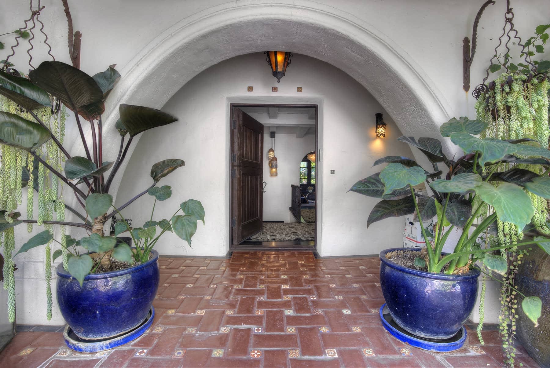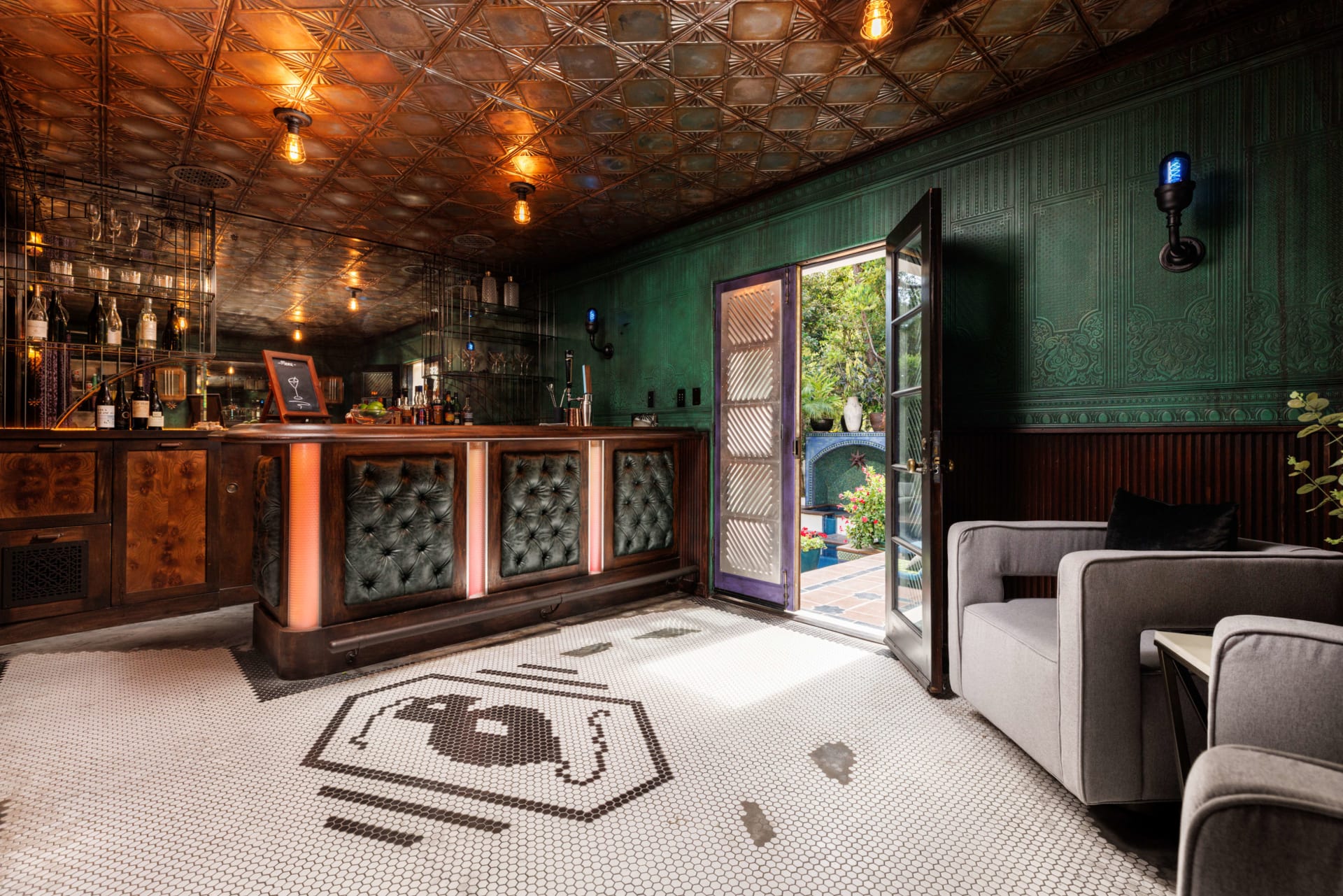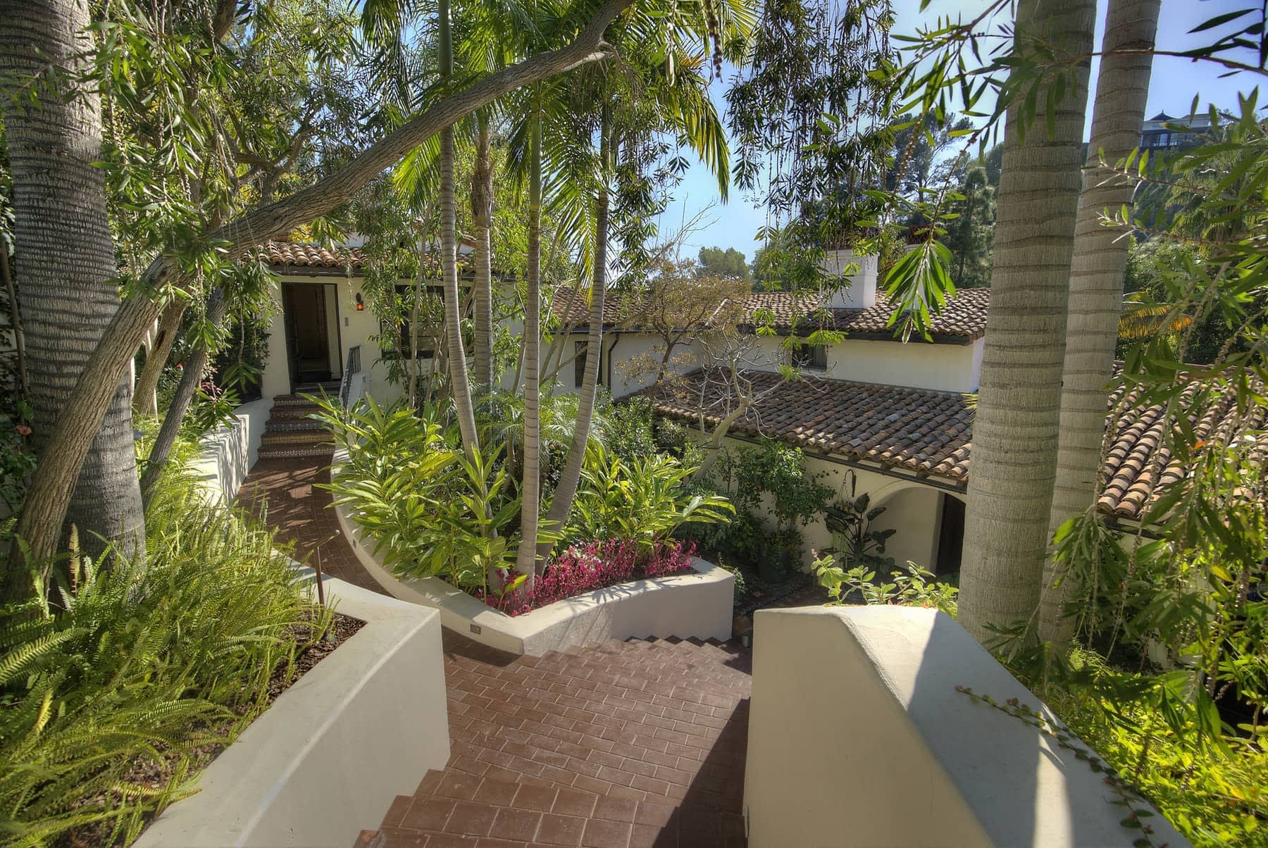 Walled and gated, the half-acre property features a two-story main house and detached guesthouse that together offer 7,400 square feet of living space. Behind a riotous collection of tropical plantings, stairs lead down from the street to the 1920s Spanish-style compound, which flaunts antique fixtures, restored terracotta tilework and an original speakeasy pub.