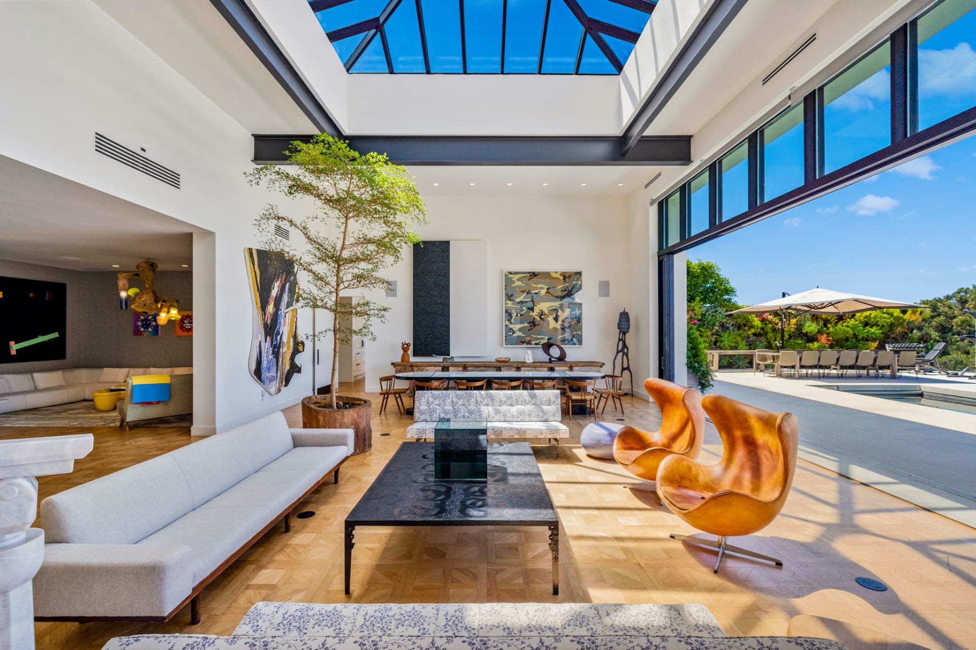 Originally built and designed in the early 1980s by the late starchitect Peter Choate, the recently renovated structure is huddled away on a gated parcel spanning over a half-acre of land, and includes six bedrooms and seven baths in almost 9,300 square feet of sun-drenched living space rife with high vaulted ceilings, expansive skylights and more than enough places to display your cherished artwork. Walls of glass also provide seamless indoor-outdoor environs, while overlooking picturesque views of the Riviera Country Club golf course and Santa Monica Mountains.