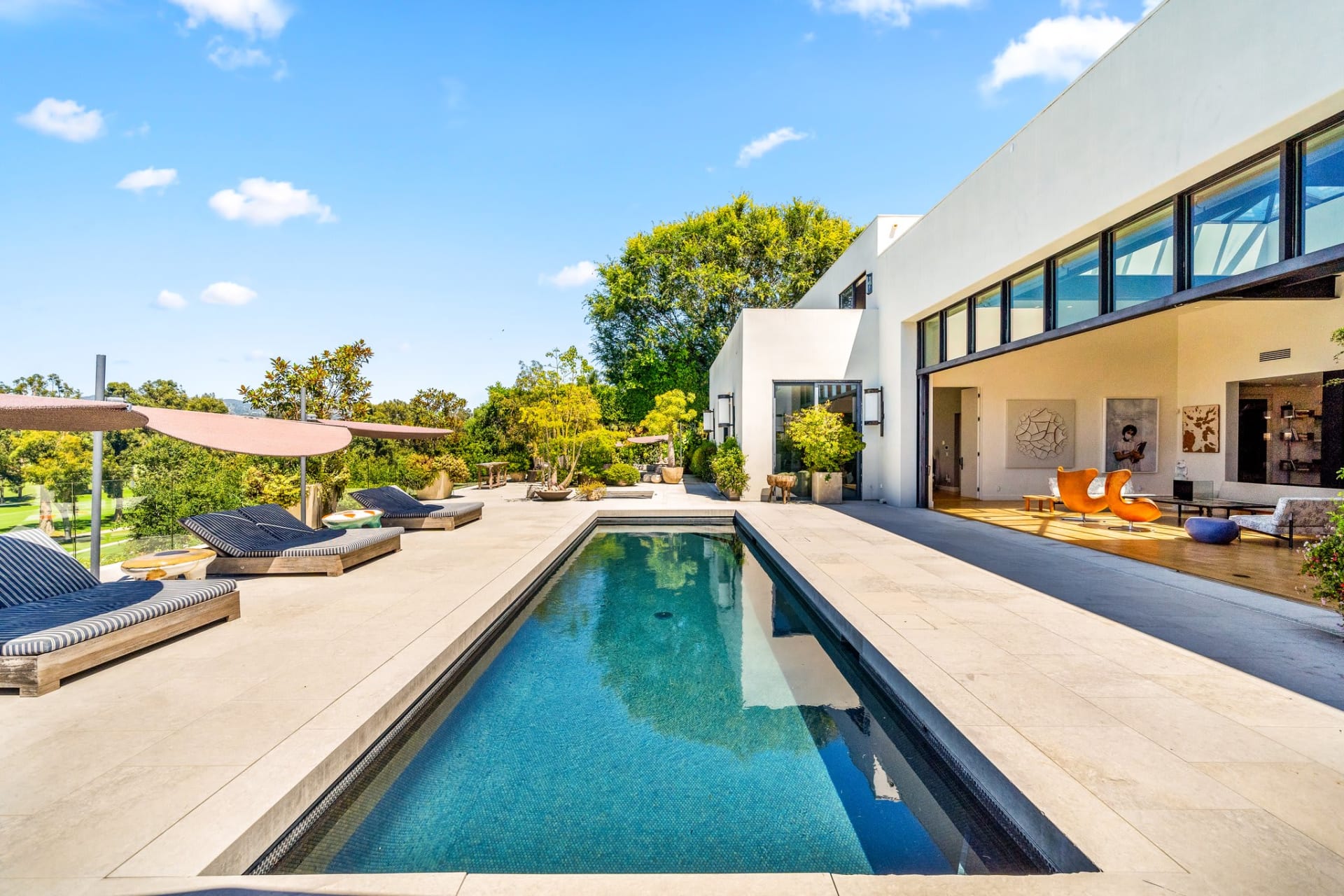 Elsewhere are glitzy amenities ranging from a plush tiered movie theater to a seated wet bar holding a glassy wine display with room for more than 800 bottles; and outdoors, the greenery-encased grounds host a saltwater lap pool and spa surrounded by a sundeck, fire-pit, and numerous spots ideal for al fresco lounging and entertaining. There’s also an attached guest suite and two-car garage.