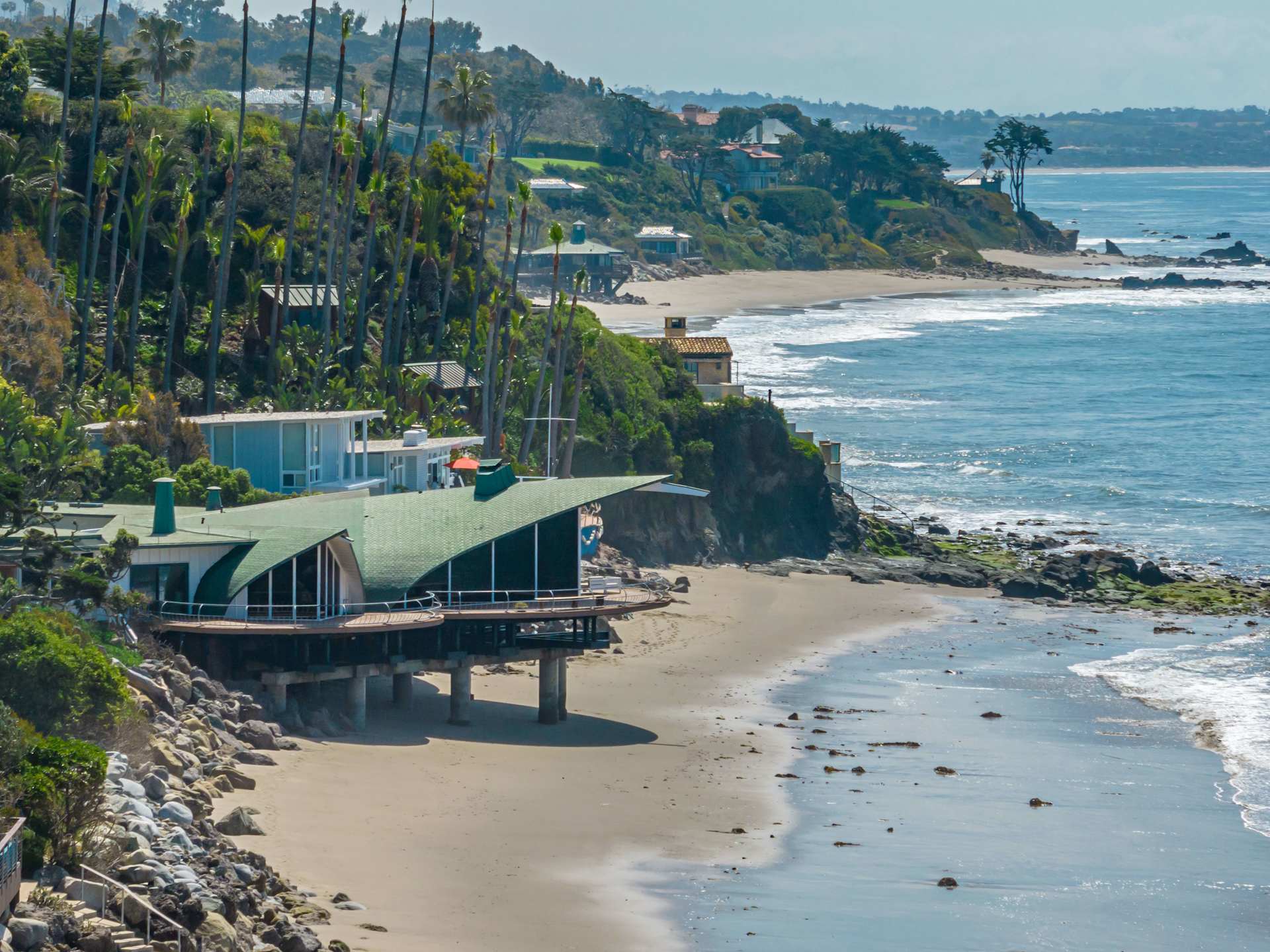 The roughly 6,200-square-foot Wave House appears to hover above the beach on stilts. The main living space is a sunken circular conversation pit. A fireplace at its center, now clad in stucco, was originally made from Santa Barbara fieldstone. There are six bedrooms, including a large primary suite on the main level with a separate seating area and deck access. The property, which measures less than an acre, also has a small guesthouse and garage.