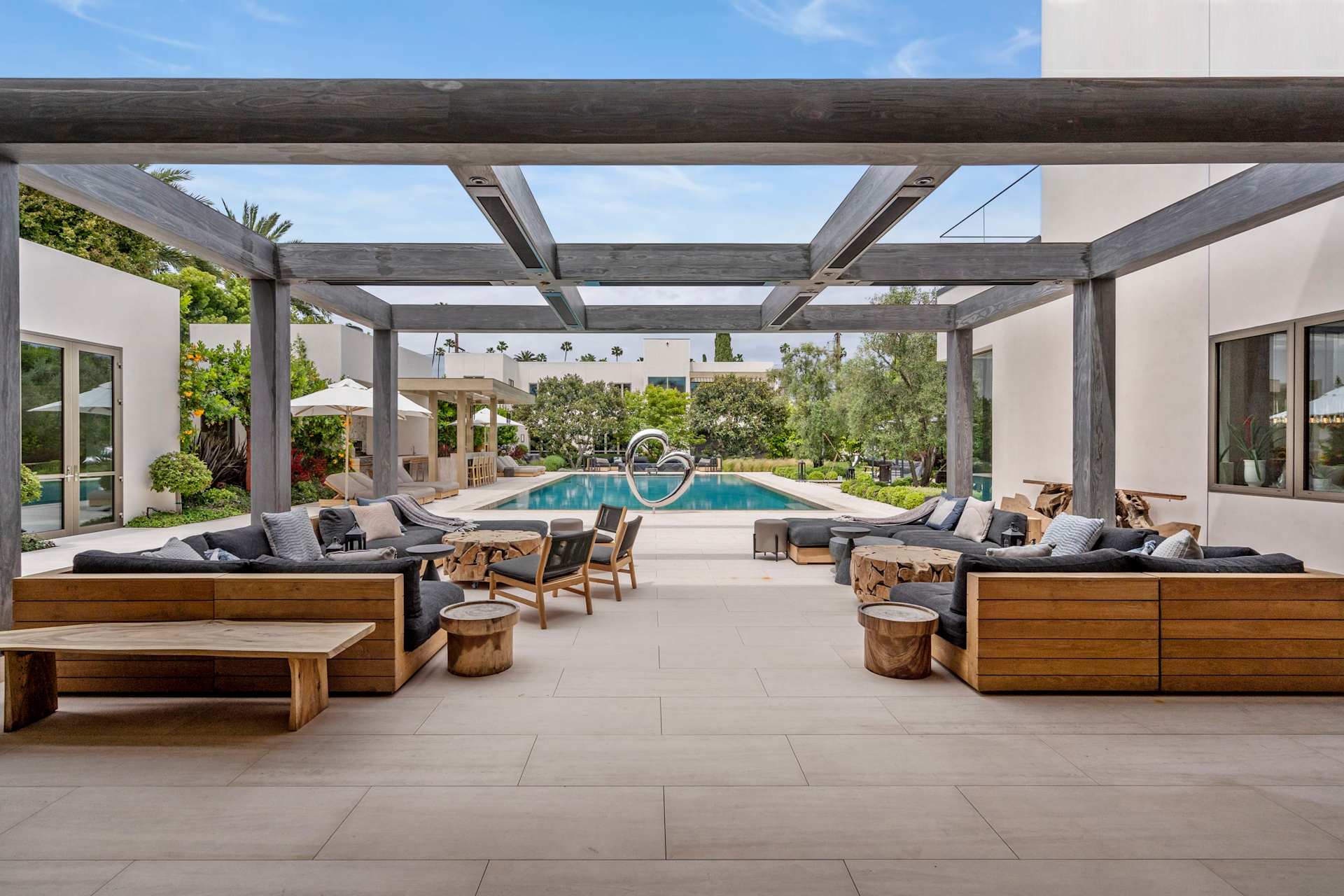 The luxurious primary suite covers approximately 2,500 sqft, complete with entry, living room, office, dual bathrooms and oversized walk-in closets. Numerous balconies overlook resort-like grounds with views of the Hollywood Hills. Two additional suites, with balconies and one junior suite are accessed from the gallery landing.
