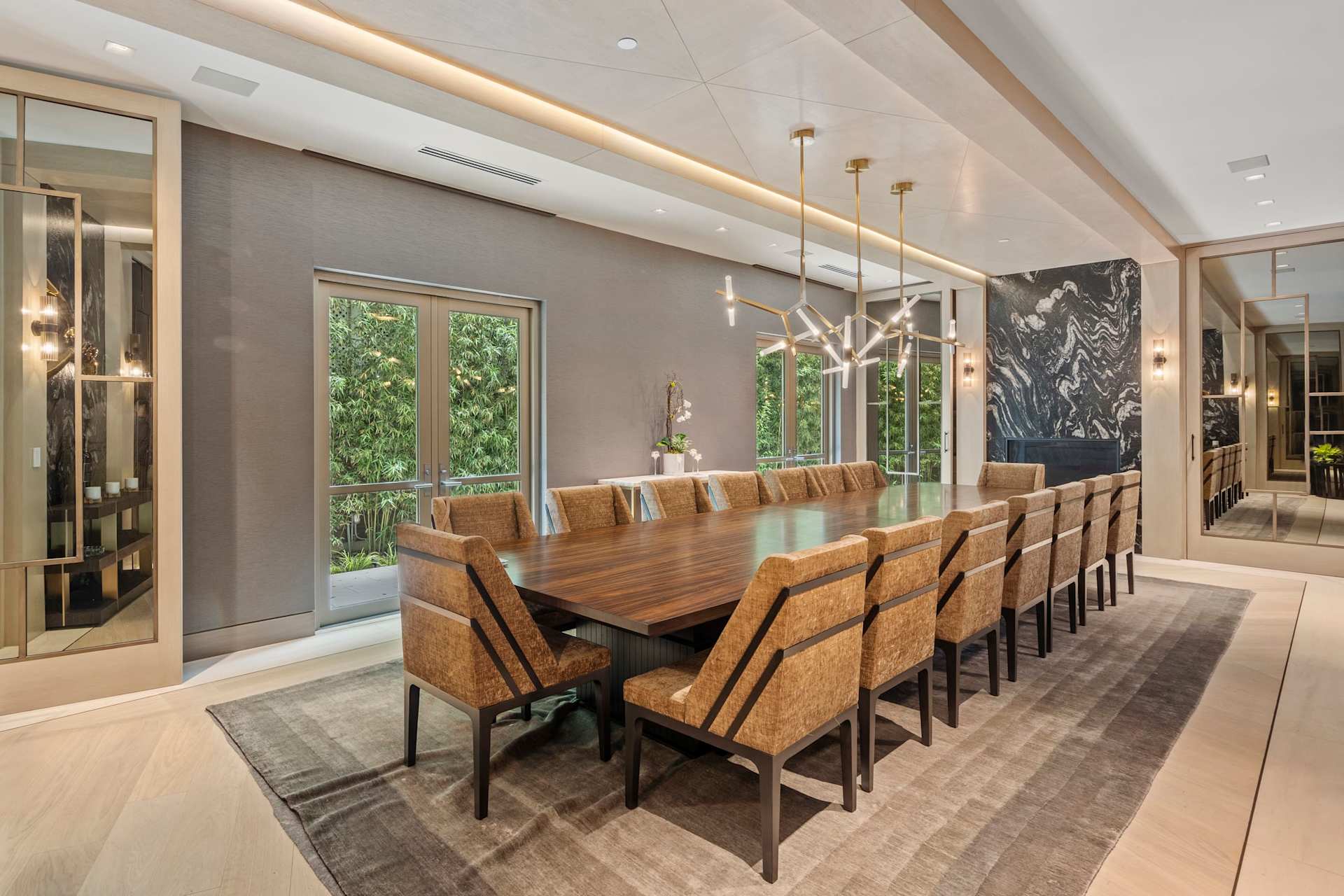 Presenting the recently remodelled and beautifully reimagined former estate of iconic best selling author Jackie Collins. Originally custom built in 1991 on just under 1 acre in prime Beverly Hills. Enter through the 10ft cantilever marble and bronze door to the incredible two-story galleried foyer with sweeping glass walled staircase. Built for entertaining the foyer provides open-plan access to the vast, grand salon-styled areas, wet bar, and formal living room, all with vistas to the pool and garden. A large kitchen, with two center islands and custom floor-to-ceiling cabinetry features both Sub-zero and Miele fixtures. An informal eating area opens spectacularly to more al-fresco dining with a custom live-edge single-slab table that seats 28 flanked by mature Olive trees, lily ponds and brass lotus flower fountain. The ground floor also houses a formal dining room, additional chef's kitchen, plush screening room and numerous marble filled powder rooms.