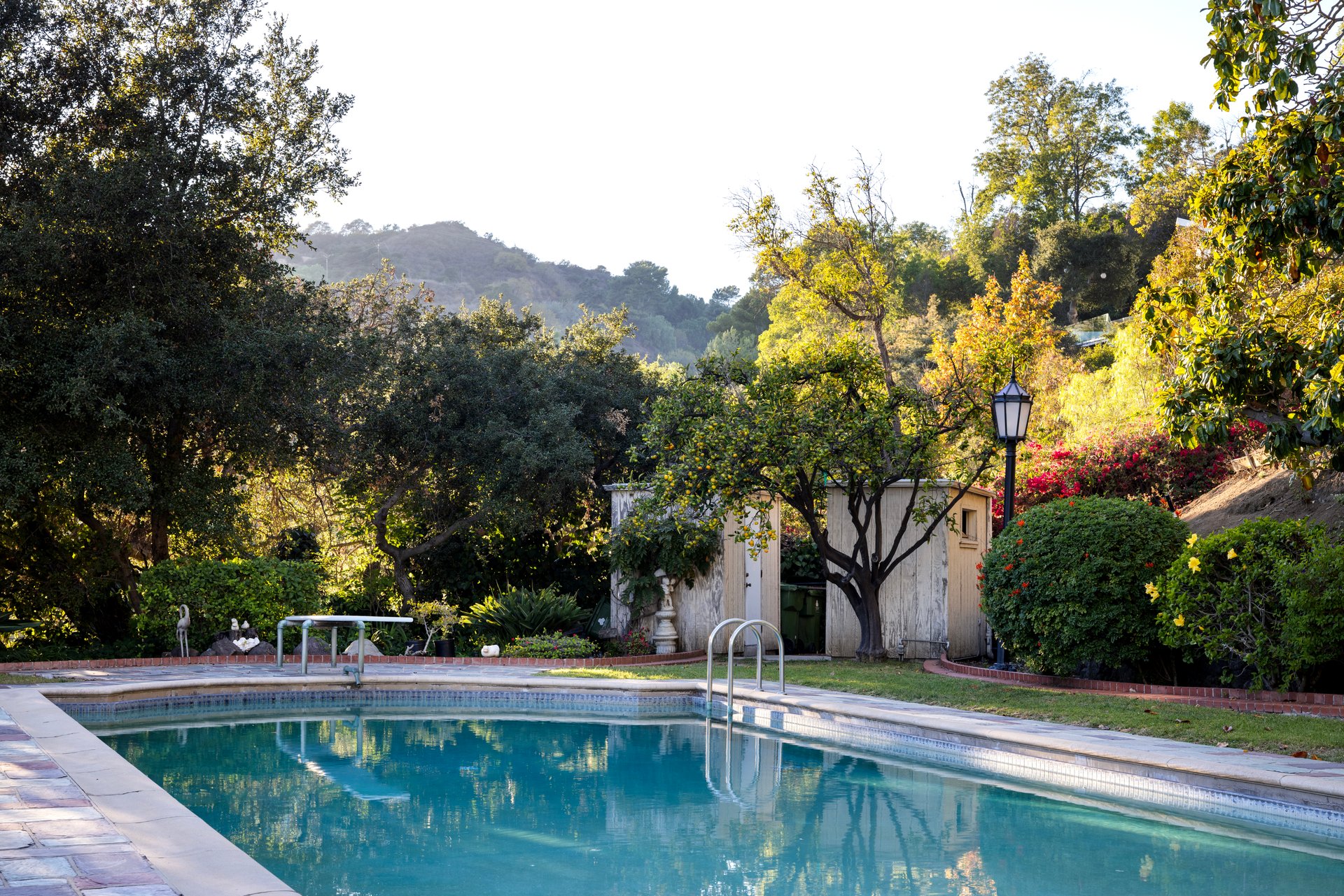 In the back of the house, there’s more patio space and a swimming pool with a diving board. The park-like grounds are filled with mature landscaping, which includes avocado trees, listing photos show.
