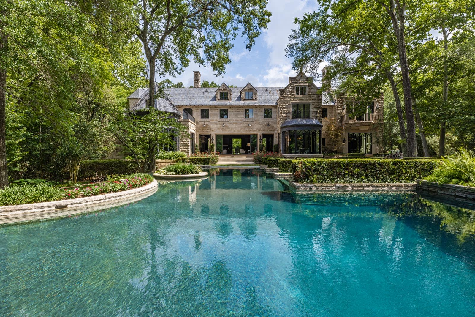 There are six bedrooms, eight bathrooms, an elevator, a custom five-car garage, and a chef’s kitchen with a walk-in cooler. The main bedroom has views of Buffalo Bayou and Houston’s downtown skyline. A manicured garden with fountains and a pool are for cooling off in Texas’s increasingly hot summers. The guest house has a pool, too.