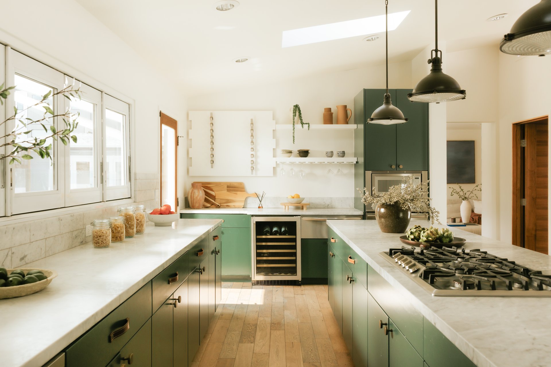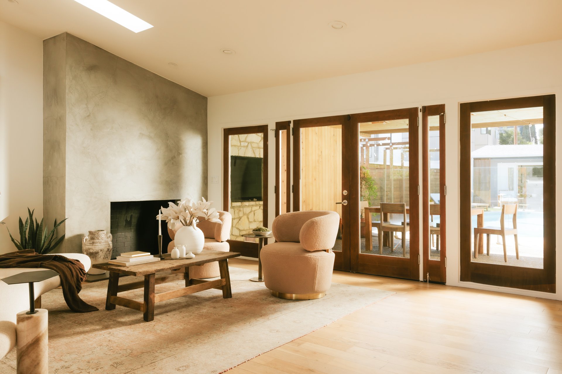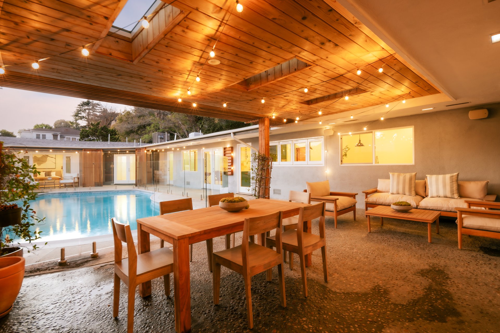 The home’s four beds and five-and-a-half baths fan out across 3,457 square feet in a U-like shape around the pool. There’s also an office and outdoor entertaining spaces.