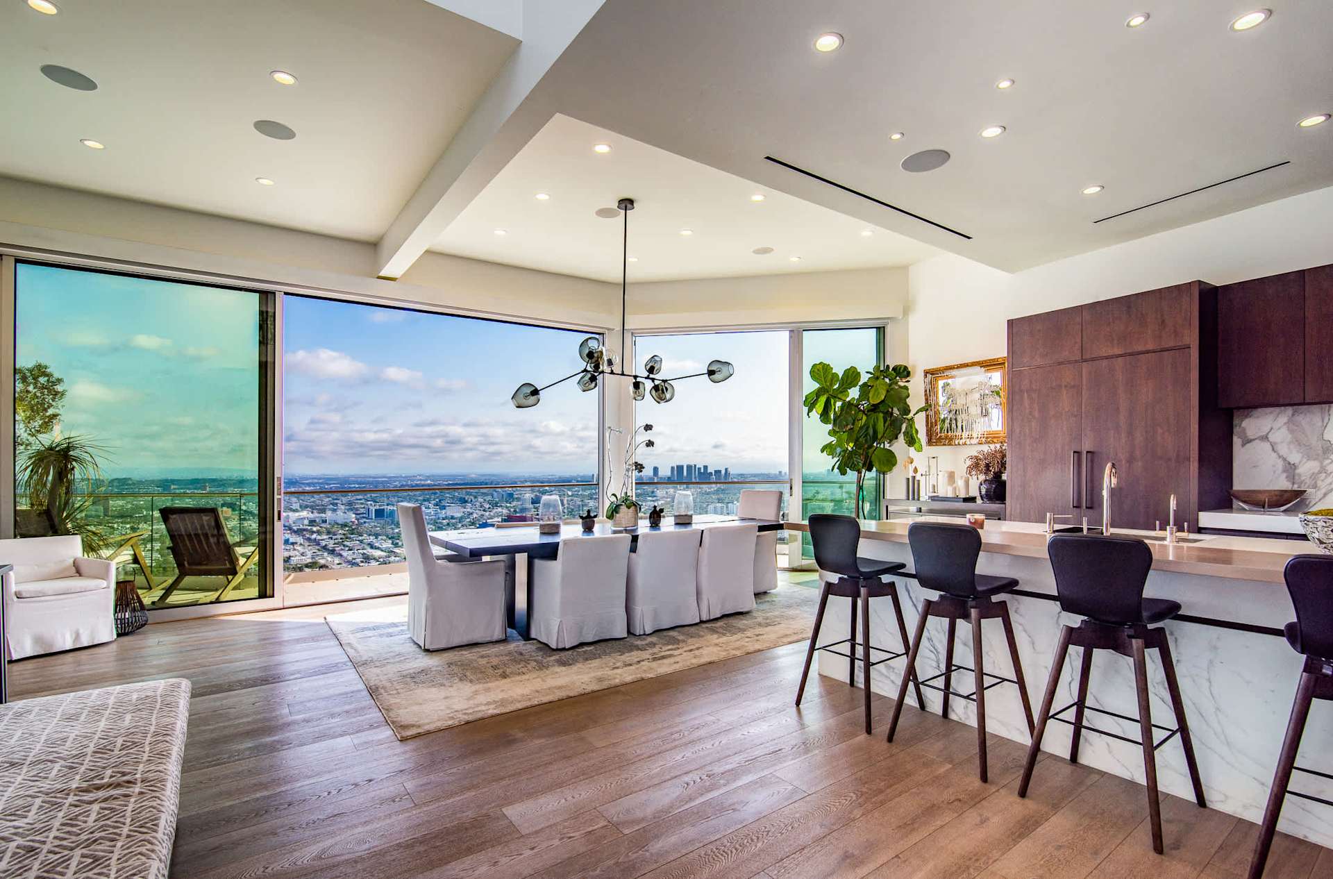Spanning 4,602 square-feet, the luxe home has three levels and unmatched city and beach views in every room. The great room has floor-to-ceiling windows and glass doors, allowing sunlight to beam in during the day. The doors open to a wrap-around terrace that is finished with clear railings. The foyer leads to a dining room, cozy living area, and a chef’s kitchen with a waterfall-edge marble island with a dining bar.
