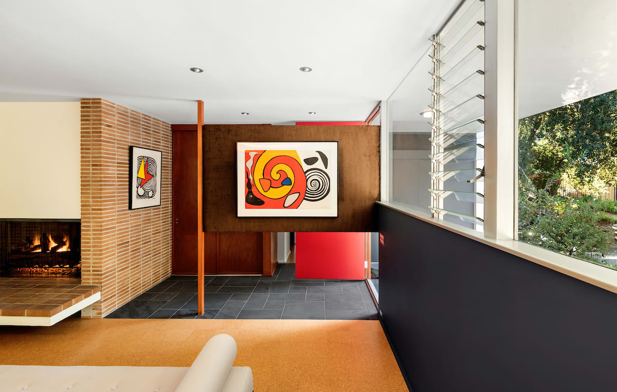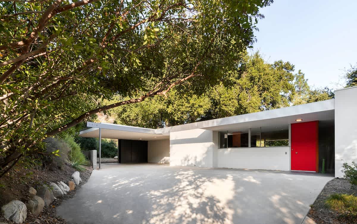 Behind its humble facade, Richard Neutra’s Taylor House offers privacy amidst oak trees. Upon entering the house, visitors are greeted by a gradual reveal of the lush scenery, framed by a central fireplace and art wall, leading to the main living area with cork floors and panoramic glass walls. The kitchen, with a mahogany bookcase separating it, showcases restored Frigidaire appliances and cabinets, maintaining the home’s original character. Vintage chrome fixtures and intricate tiles in the primary bedroom’s bathroom add to its charm. Modern amenities like a full-size laundry area, HVAC system, two-car carport, alarm system, and outdoor spaces ensure comfort and convenience. Conveniently located near dining, shopping, and institutions like JPL, Cal Tech, and Art Center, the Taylor House offers a peaceful retreat with easy access to downtown, Pasadena, and the San Fernando Valley. The mid-century Taylor House is now available for rent.