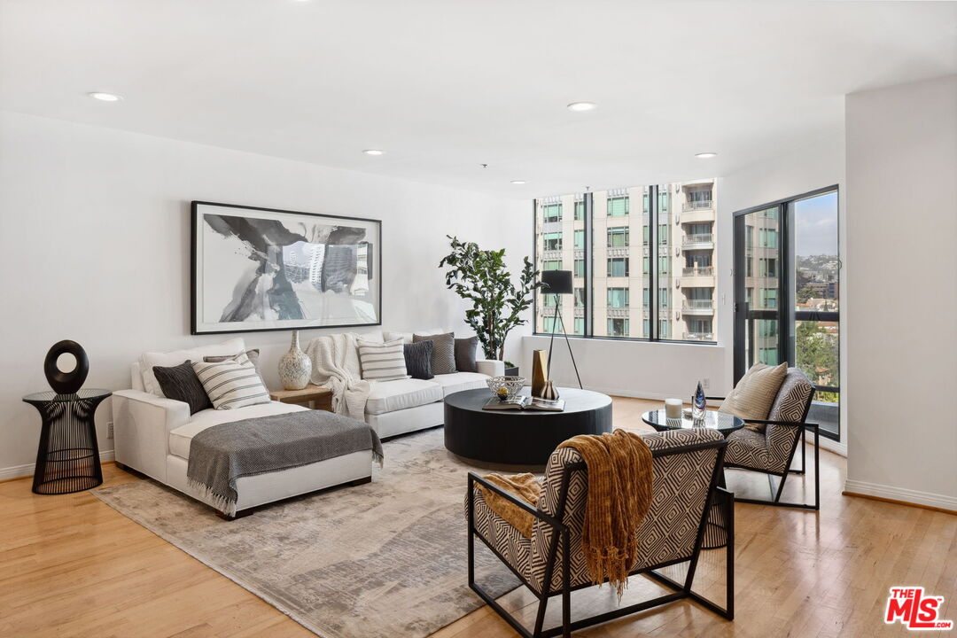 Spacious 2 bedroom 2.5 bath unit with over sized entry way leads to a huge open combination living, family room, dining area space. Both bedrooms and the living/dining areas have floor to ceiling windows and patios which fill the condo with light. Gorgeous hardwood flooring throughout. The kitchen has granite counters, built-in appliances and an adjacent, separate laundry room. The spacious primary bedroom is large enough for a home office or large seating area. It also features an ample walk-in closet and spa-like bath with separate tub and shower areas. Beautiful Park Wilshire offers valet, pool, spa, gym, party room, meeting room and several lounge areas.